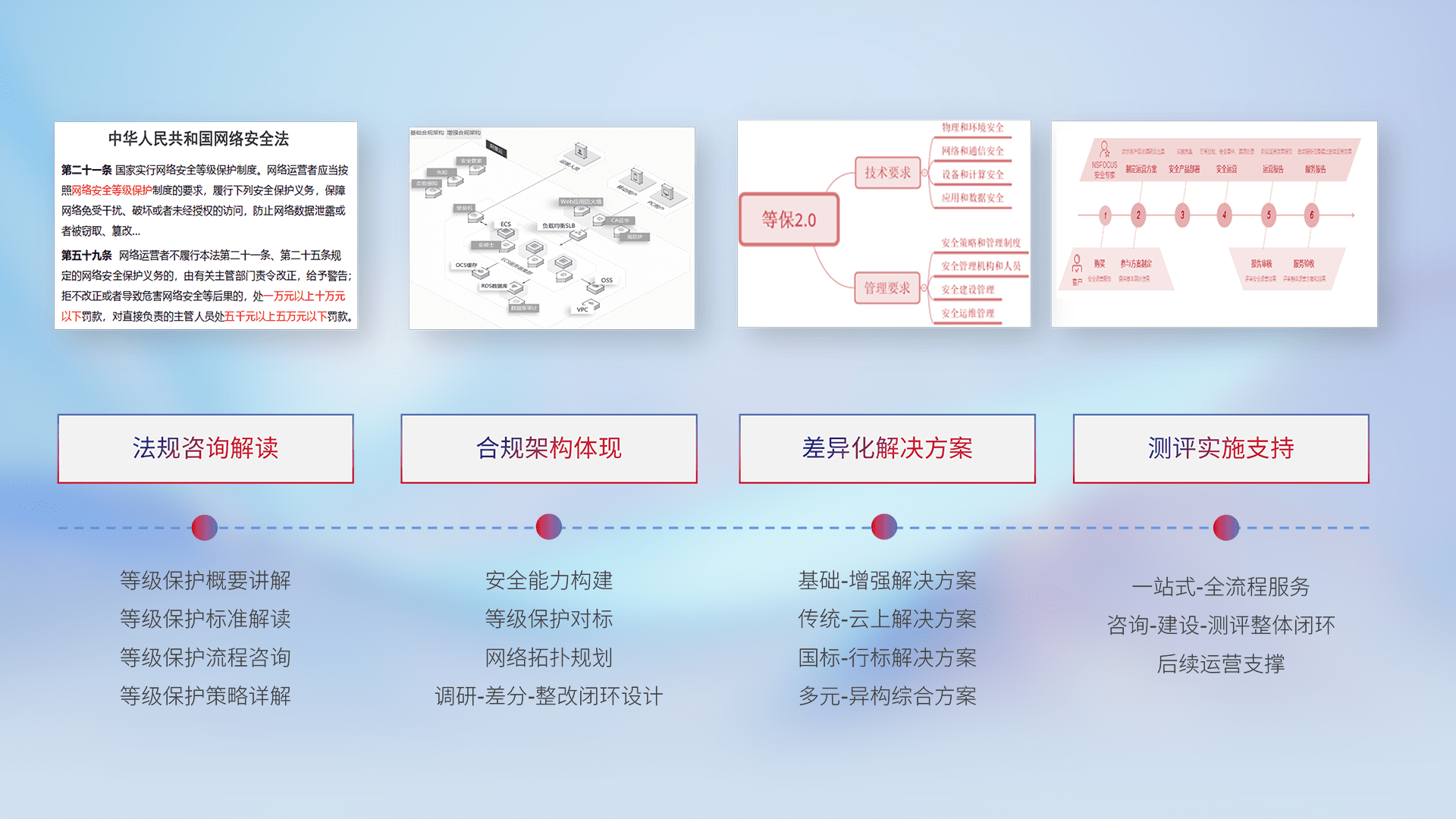 通过专业的法律咨询解读、、合规架构体现、、差异化解决方案、、、、测试实施支持等服务,,,为客户量身打造等保合规体系。。。